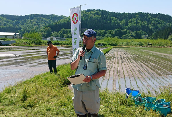 5月19日には、ペースト肥料を用いた二段施肥田植機の実演会が開催され、、実証区となる農事組合法人このこのファームの圃場には、実演を見ようと県普及関係職員、JA、資機材メーカー、生産者等、約50名が集まった。