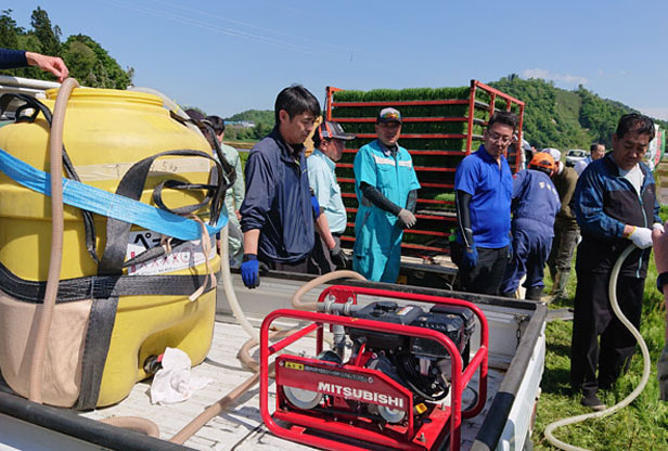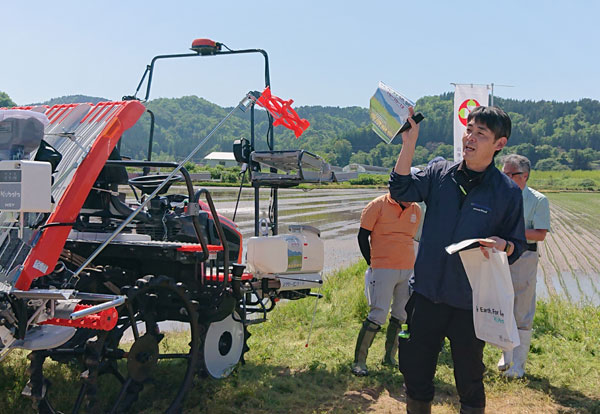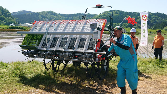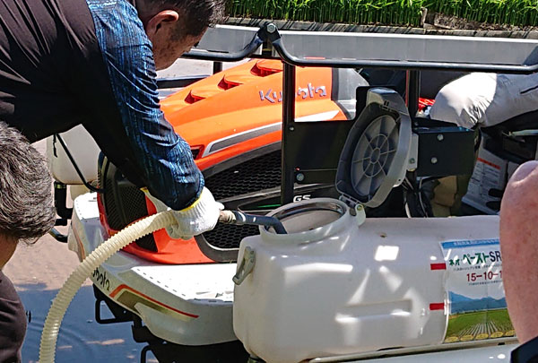 説明後は、農事組合法人このこのファームの国分代表による田植作業が開始された。肥料は、重い肥料袋を持ち上げる必要がなく、大型タンクからペーストチャージャーで簡易に補充できるため、苗の供給作業に集中することができる。大区画面積の圃場では大幅な軽労化が期待される。