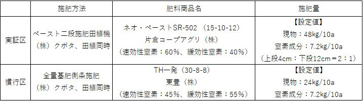 実証区および慣行区の概要、施肥体系は以下の通り。