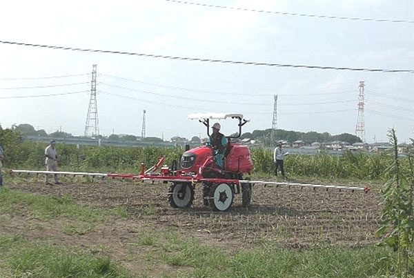 実証圃場では、クボタアグリサービス(株)東京事務所の鈴木部長から収穫機の説明があった。収穫機はソバ専用コンバインで、シーブを40㎜目合いに改造したものを使用。隣接ほ場では、病害虫防除に使用した乗用管理機+ブームスプレーヤーのデモンストレーションも行われた。