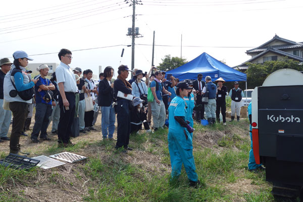 県では、ゴマは大豆にとって代わる作物、遊休農地解消対策になり得るなどの考えもあり、高収益作物としても大いに期待されている。実演会には海外からの参加者も見受けられ、ゴマ栽培に対する関心の高さがうかがえた。なにより、本実証に意欲的に取り組む生産者はじめ、メーカーや実需者を含めた関係者の熱意に感じ入る一日となった。(みんなの農業広場事務局)