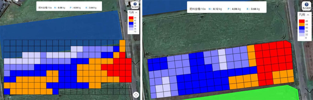 右 :昨年のKSASリモセン生育データをもとにした可変施肥マップ(実証区2)