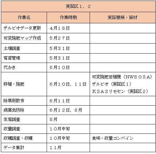 - ザルビオの地力マップデータ(実証区1)と、KSASリモセンの前年度生育マップ(実証区2)に基づく5段階可変施肥と定量施肥(対照区)の比較検討