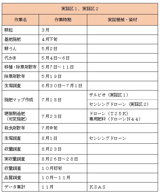 実証区1でザルビオ・フィールドマネージャー(以下、ザルビオ)、実証区2でドローンによるリモートセンシングをそれぞれ活用し、マップ連動可変施肥による穂揃期追肥区(実証区1、2)と、肥効調節型肥料の基肥1回施肥区(対照区)での収量・収支を比較する。