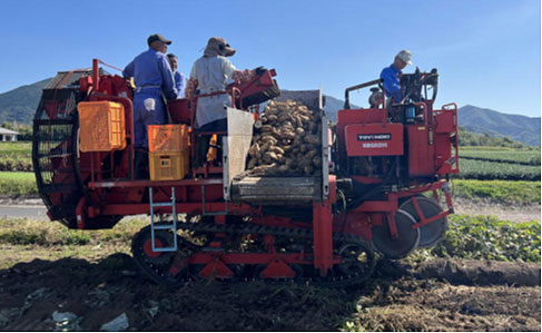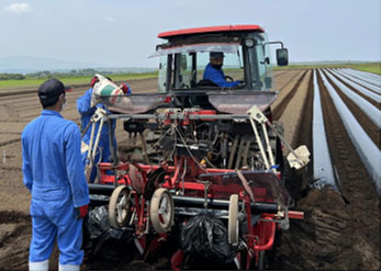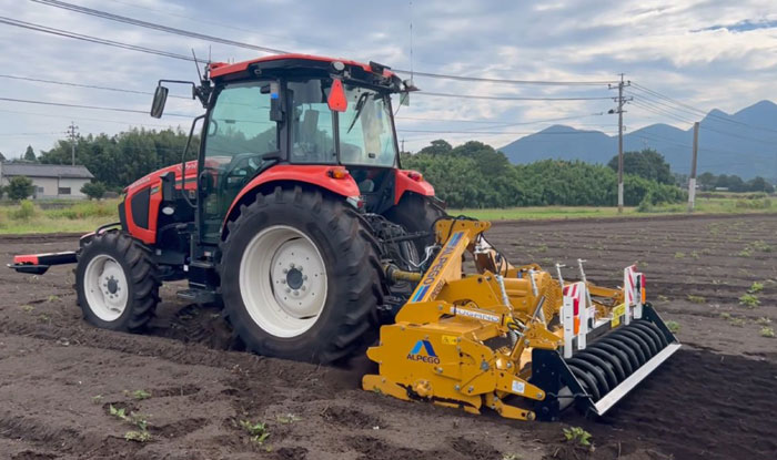 サツマイモ栽培の植付け前作業において、ロボットトラクタと並行作業を行う。