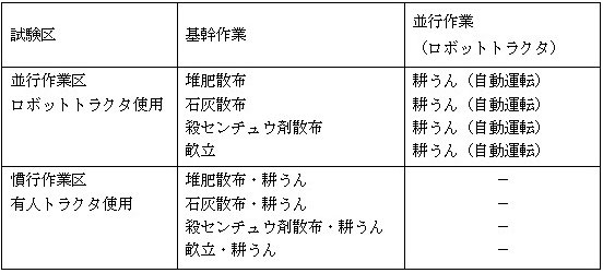 ①サツマイモの植付け前準備作業でオペレータが基幹作業を行い、監視下において隣接ほ場でロボットトラクタMR1000Aの耕うんを同時並行作業を行った。同時並行作業を行うことで全体作業時間の削減効果が認められた。