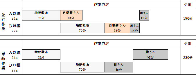 並行作業時間196分、単独作業230分で、全体ほ場面積51aで作業時間を34分削減した(図1)。
