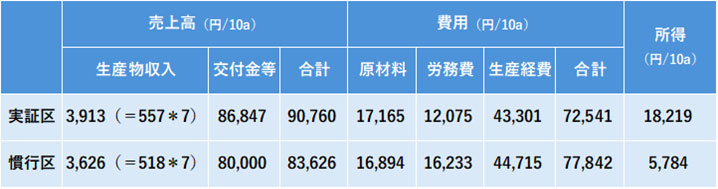 以上のことから、実証区の所得は、慣行区より12,435円/10a高くなった。