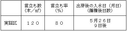 苗立数は120本/㎡、苗立率は80%と高い水準だった一方、圃場周囲のうち排水不良箇所が出芽不良となった。
