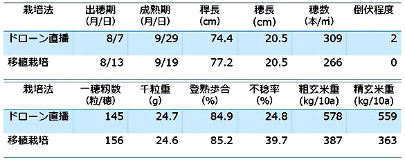 ドローン直播栽培の出穂期が移植栽培より早く測定されたのは、移植栽培より栽植密度が高いことが影響したと考えられた。