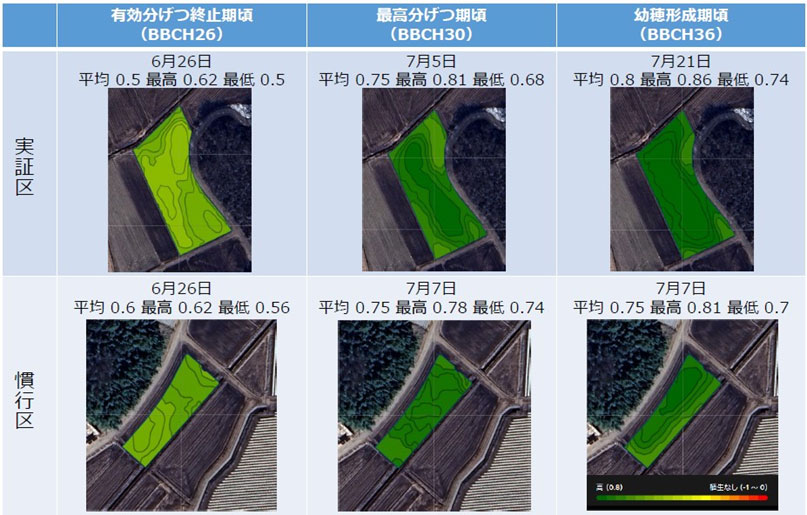 実証区と慣行区で、ザルビオフィールドマネージャーで測定したNDVIを比較した。